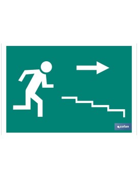 Señal de evacuación de Salida bajada escalera con flecha a la derecha. Señal de Pictograma. Tamaño y material a elegir (luminiscente y adhesivo)