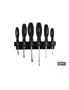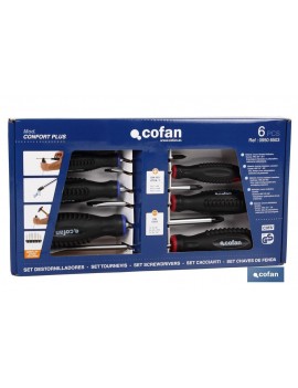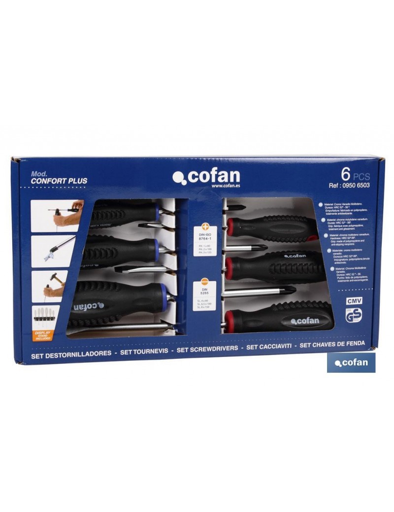 Juego de 6 destornilladores + display porta destornilladores, planos y phillips, modelo confort plus en caja de cartón expositora.