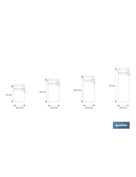 Set de cuatro frascos de vidrio para almacenamiento de alimentos. Fabricados en vidrio, acero inoxidable y silicona. Con tapa de sellado hermético que funciona a clip y con agarres de acero inoxidable. El set se compone de los siguientes tamaños: 750 ml, 1150 ml, 1500 ml y 2100 ml. Productos ligeros y fáciles de usar. Libres de agentes contaminantes y cuidan el medio ambiente. Aptos para uso alimentario.