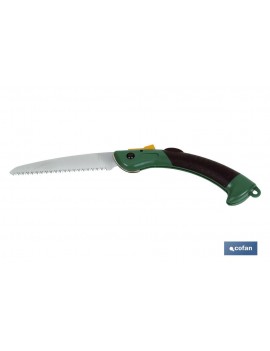 Sierra de poda plegable manual. Especialmente indicada para trabajos de jardinería y agricultura. Fabricada con empuñadura ergonómica y antideslizante para una máxima comodidad y sensación resistente al cortar, complementado con un dispositivo de bloqueo en la hoja. Diseño compacto, ligero y plegable con un pequeño orificio que permite colgarla para facilitar su transporte y almacenamiento.