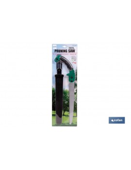 Sierra de poda manual y portátil. Especialmente indicada para trabajos de jardinería y agricultura. Fabricada con empuñadura ergonómica y antideslizante para una máxima comodidad y sensación resistente al cortar, complementado con una funda de protección para evitar cortes y pinchazos. Diseño compacto y ligero que facilita su transporte y almacenamiento.