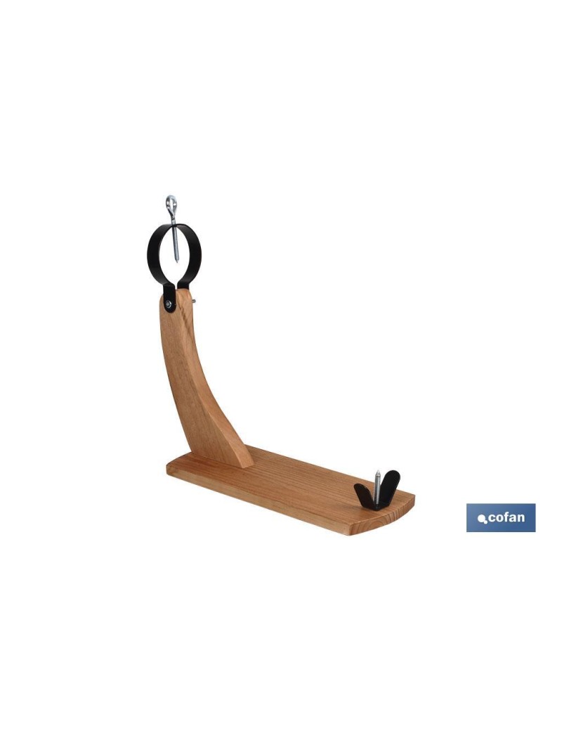 Jamonero tipo góndola modelo Reserva, con herrajes de hierro pintado y pintura atoxica antioxidante. Producto fabricado en madera. Cuenta con base estable y fijación ajustable. Posee una estructura resistente y duradera. Accesorio práctico y cómodo.