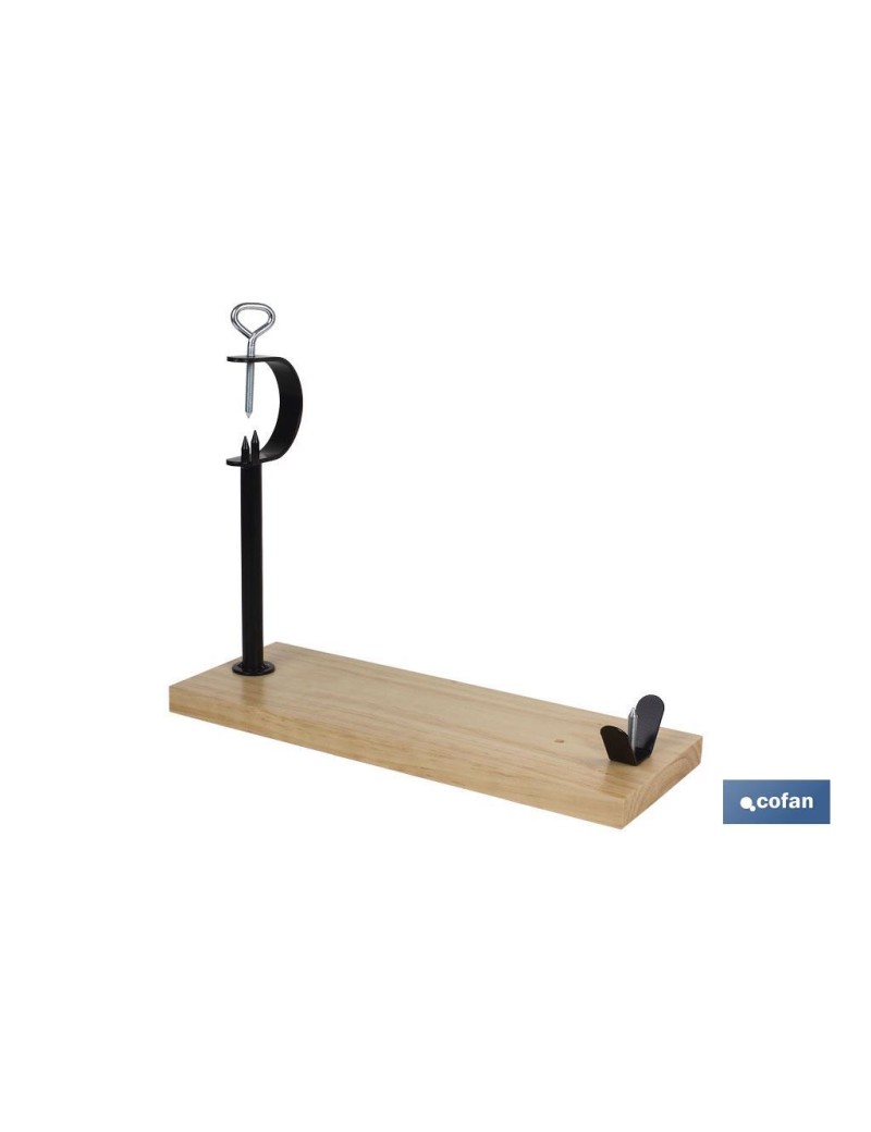 Soporte Jamonero Modelo Serrano, fabricado en madera. Con base estable y fijación ajustable. Posee una estructura resistente y duradera.
