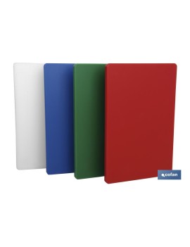 Tabla de corte con forma rectangular fabricada en polietileno. Disponibles en dos medidas y distintos colores: azul, verde, rojo y blanco. Tamaños: 30 x 20 x 1,5 cm, 35 x 25 x 1,5 cm. Higiénica y fácil de limpiar. Para cortar todo tipo de alimentos desde carnes y verduras hasta pescado. Es apta para el lavavajillas. No conserva olores ni sabores.