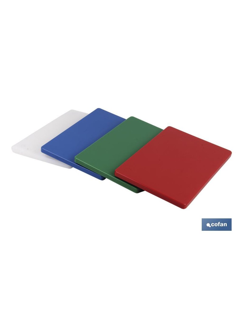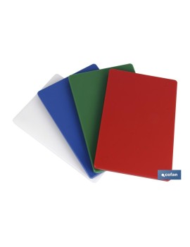 Tabla de corte con forma rectangular fabricada en polietileno. Disponibles en dos medidas y distintos colores: azul, verde, rojo y blanco. Tamaños: 30 x 20 x 1,5 cm, 35 x 25 x 1,5 cm. Higiénica y fácil de limpiar. Para cortar todo tipo de alimentos desde carnes y verduras hasta pescado. Es apta para el lavavajillas. No conserva olores ni sabores.