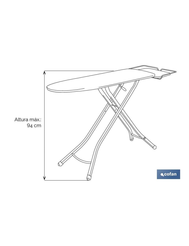 Tabla Planchar Modelo Tívoli modelo con bandeja especial para centro de planchado, patas anti movimiento y varias posiciones en altura. Con medidas en 125 x 41 cm.