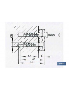 Diámetro de Taladro D: 5 | Longitud del Taco LD: 36 | Profundidad del Taladro LB: 46 | Profundidad Zona Expansión LV: 25 | Espesor a Fijar S: 9 | Piezas por Caja: 100 | Piezas por Paquete: 2700