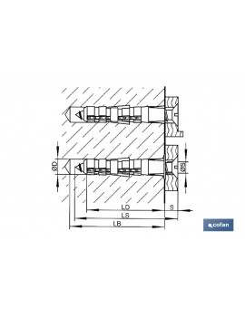 Diámetro de Taladro D: 6 | Longitud del Taco LD: 30 | Profundidad del Taladro LB: 40 | Diámetro de Tornillo [mm]: 3,5 - 5,0 | Piezas por Caja: 100