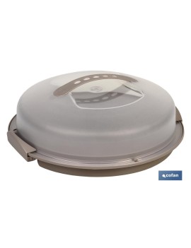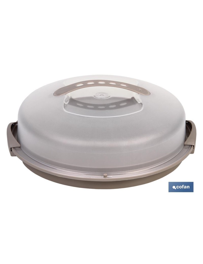 Tartera redonda modelo Pavlova con tapa opaca. La solución más práctica y segura para transportar tus alimentos (bocadillos, sándwich, cupcakes...) allá donde vayas de forma cómoda y fácil. Cuenta con cierre con dos bloqueos de seguridad y asa transportadora. Asa, cierre, y base en colores variados: Crema, verde, rojo, azul, gris, blanco. Fabricada en polipropileno. Las medidas del producto son de 34,5 x 11 cm.