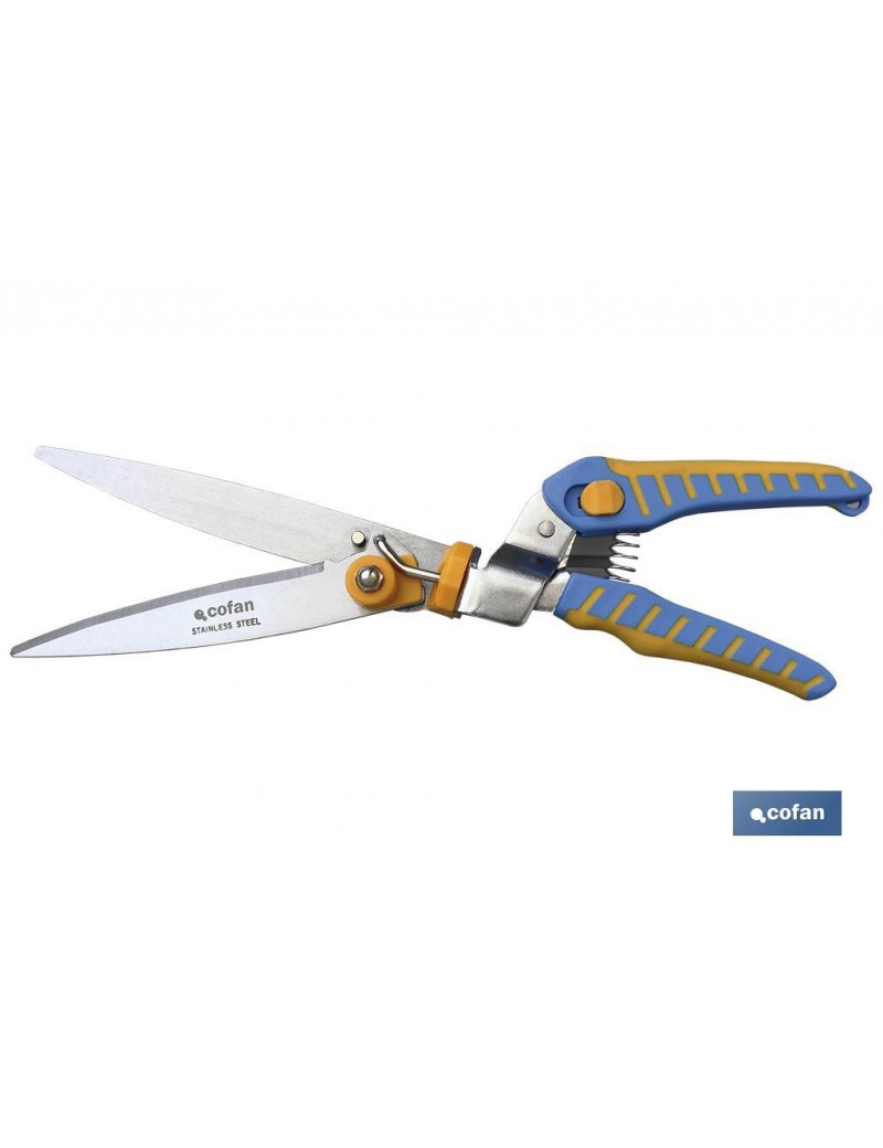 Tijeras Cortacésped profesional en Acero INOX. de 34 cm. Con corte Ajustable a 180°, sus mangos son Ergonómicos y cuenta con 6 posiciones de corte.