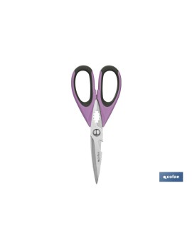 Tijeras multiusos modelo Sena. Fabricadas en acero inox. Disponibles en color morado y verde clarito. No aptas para lavavajillas. Aptas para uso alimentario. Las medidas del producto es de 22 cm.