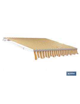 Toldos Plegables con motor eléctrico color amarillo/blanco en 4 m de ancho, brazos de doble cable acero, muelle de alta calidad y fabricado en Poliéster 280-300g/m2, protección UV impermeables.