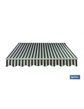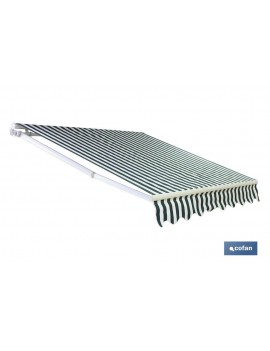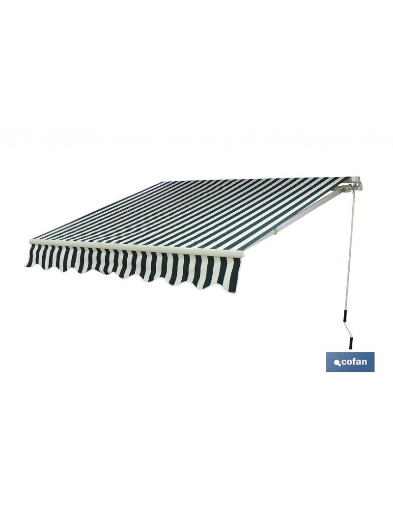 Toldos Plegables color verde/blanco en 2.5, 3, 3,5 y 4 metros de ancho, con brazos de doble cable en acero, muelle de alta calidad y fabricado en Poliéster 280-300g/m2, protección UV e impermeables.