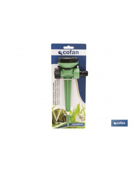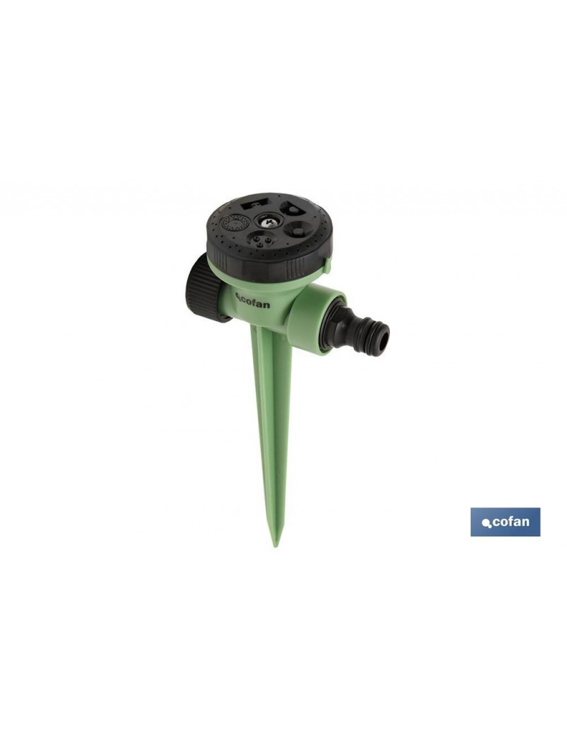 Torreta aspersor de riego con 5 posiciones. Conexión directa sin necesidad de racores gracias a la punta de plástico. Selección de posición mediante un simple giro. Material ABS.