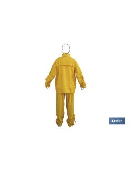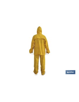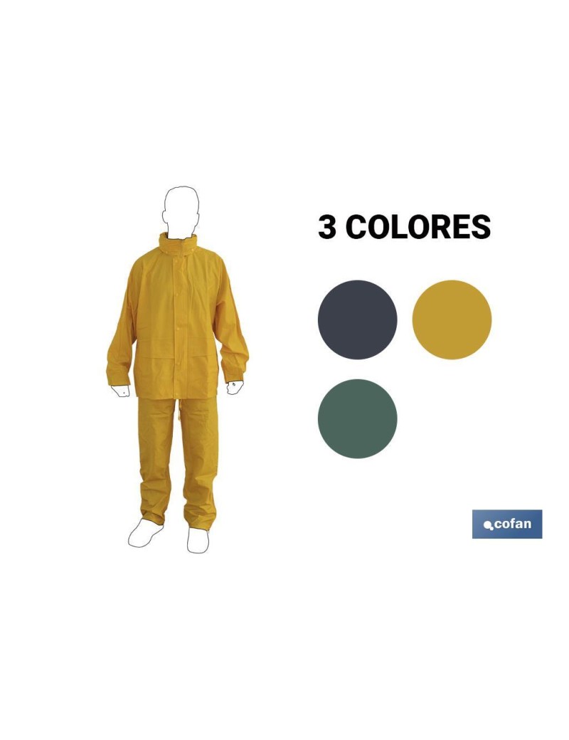 Traje de agua compuesto por chaqueta y pantalón, es muy ligero, resistente y flexible con capucha oculta en el cuello. Ventilación interior y puños elásticos interiores. Cuenta con dos bolsillos con tapa para que no entre el agua. El cierre de la chaqueta es con corchetes aportando comodidad. Disponibles en tallas desde la S hasta la XXXL y en colores como Amarillo, Verde y Azul Marino.