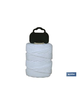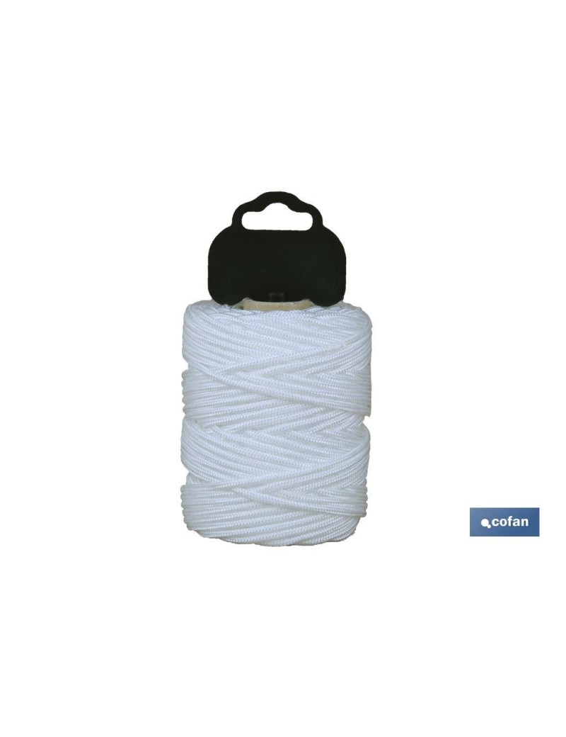 Hilo de albañil de 1mm, trenzado en poliamida de gran flexibilidad color blanco. Hilo en blíster de 50, 100 o 200 metros de longitud. Resistente al rozamiento. Indicado para albañilería, paquetería, y bricolaje.