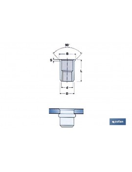 Diámetro Rosca [m/m]: M - 4 | L [mm]: 10 | D: 5,9 | B m/m: 6,75 | Grosor Superficie para Remachar [mm]: 0,5 | S m/m: 0,50 - 1,50