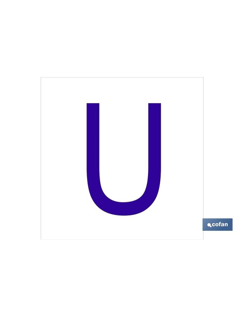 U Letra en glasspack adhesivo con el fondo blanco y carácter azul con medida en 62 x 62mm