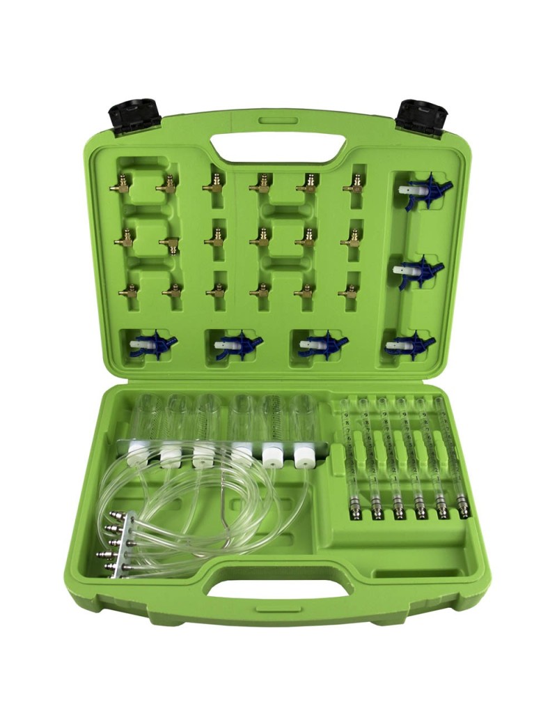 El propósito de este instrumento es medir con rapidez y eficacia la cantidad de combustible que cada inyector vuelve al tanque de depósito, de modo que usted sabrá si algún inyector está dañado. Adecuado para uso en Bosch, Siemens, Denso y Delphi inyector. Incluye: Percha para colgar con 6 botellas de medición graduadas 6 tubos de medición (para crack única condición) + tubos blancos de descuento + estuche de almacenaje