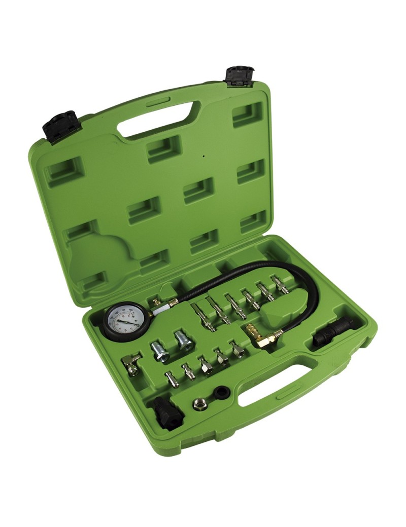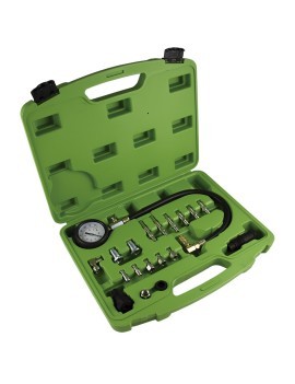 Kit completo para medir la compresión de vehículos diesel. Gran rango de adaptadores para medir en la mayoría de vehículos del mercado. Sistema de enganche rápido para trabajos en puntos de dificil acceso. Adaptador en ángulo y adaptador a roscas de M18 y M24. Dispone de válvula de descarga y de sistema de retención de lectura. Aplicaciones: Ford, BMW, Mercedes Benz, VW, Citroën, Mitsubishi, Toyota, Peugeot, Renault, Volvo, Mazda. M18x1.5mm M24x2.0mm M24x1.5mm M10x1.0x68mm M10x1.25x54mm M10x1.25x68mm / M12x1.25x45mm 0-1000PSI 0-70 Kgs/cmt2
