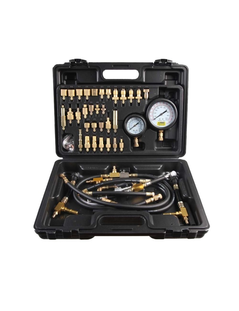 Contiene todos los elementos necesarios para comprobar la inyección de combustible en la mayoría de los coches nacionales y extranjeros. Cuenta con un gran manómetro de 3-1/2" con lecturas duales de 0-145 psi y 0-1000 KPA y un manómetro de 2-1/2" con lecturas duales Todos los adaptadores, manómetros y conjuntos de mangueras cuentan con un sistema de acoplamiento rápido.