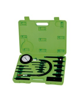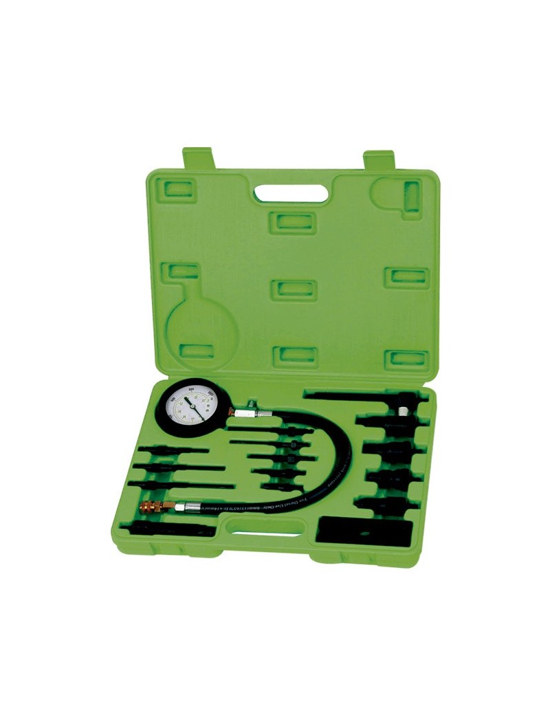 Kit completo para medir la compresión de vehículos diesel. Gran rango de adaptadores para medir en la mayoría de vehículos del mercado. Sistema de enganche rápido para trabajos en puntos de dificil acceso. Adaptador en ángulo y adaptador a roscas de M18 y M24. Dispone de válvula de descarga y de sistema de retención de lectura. 0-70BAR 0-1000 PSI