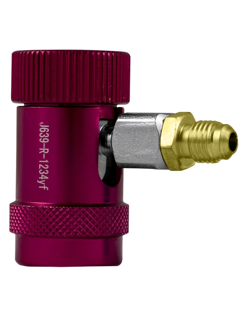 Adaptador de aire acondicionado / refrigerante de conexión rápida R1234YF. Rojo (alta presión). El diseño de conexión rápida permite una completa seguridad. Con conexión que protege contra lesiones y pérdida de refrigerante si se desconecta bajo presión. Uso: AACC y refrigerante Material: latón y metal Color: rojo, azul Tamaño: Altura 55 mm, Diametro 30 mm. Peso: 194g