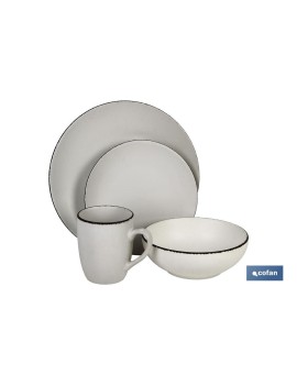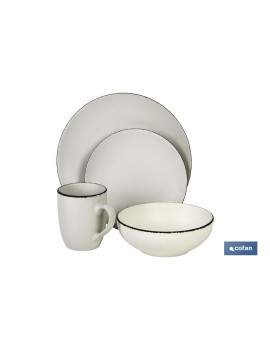 Vajilla de Cerámica Modelo Mapta. Da vida a tu mesa con diferentes platos de cerámica en distintos colores sencillos y muy decorativos. Su color es beige con borde vintage. Especial para vestir una mesa y combinar con las vajillas Modelo Mirijan y Modelo Rachela. Conseguir un toque diferente es clave para una decoración discreta, pero con encanto. No dejes de lado la decoración de tu mesa y disfruta de ella con estos platos de cerámica esmaltada. El pack cuenta con 16 piezas: 4 platos llanos cuya medida es 26,67 cm 4 platos postre de 20,32 cm 4 cuencos de 17,78 cm. 4 tazas de 340ml.