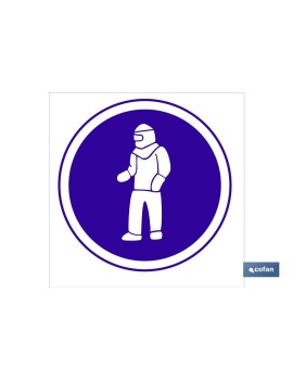 Señal de obligatoriedad en el uso de traje de seguridad. Tamaño y material a elegir.