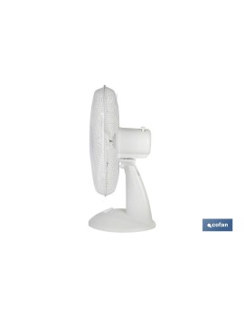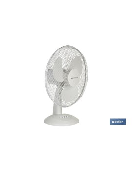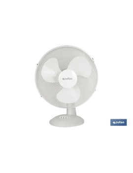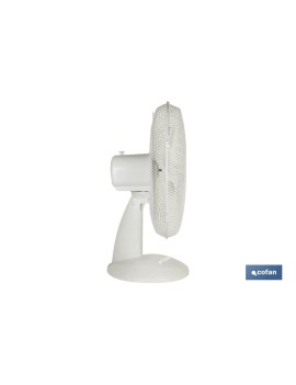 Ventilador de sobremesa Blanco Modelo Solano con tres velocidades. Cuenta con una potencia de 44 W. Un ventilador con gran caudal de aire, muy silencioso, con oscilación a 90° de derecha a izquierda. Cuenta con 3 palas de polipropileno y el tamaño de sus aspas es de 40 centímetros. El ventilador se enciende mediante los pulsadores de la base: 0 Apagado 1 Baja velocidad 2 Velocidad media 3 Velocidad alta. Sus medidas son de 43 x 25,5 x 53,5 cm y la longitud del cable de 1,60 metros. Su peso es de 2,35 kg.