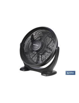 Ventilador de gran tamaño Modelo Toledano en color negro. Cuenta con 5 palas de polipropileno y tres velocidades. Su potencia es de 90 W. Posee un asa para transportar de manera fácil y cómoda, ubicada en la rejilla trasera. También tiene una rejilla de protección. Se puede ajustar la inclinación del cabezal del ventilador. El motor cuenta con protector contra sobrecalientamiento. Sus medidas son de 58,5 x 25,5 x 59,5 cm y el tamaño de las aspas es de 50 cm. La longitud de cable es de 1,60 metros y su peso de 3,57 kg.